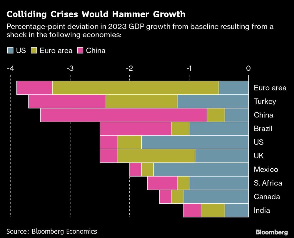 Drawing on a suite of macro models, Bloomberg Economics has estimated the aggregate impact if everything goes wrong at the same time. Unsurprisingly, the results aren’t pretty.
