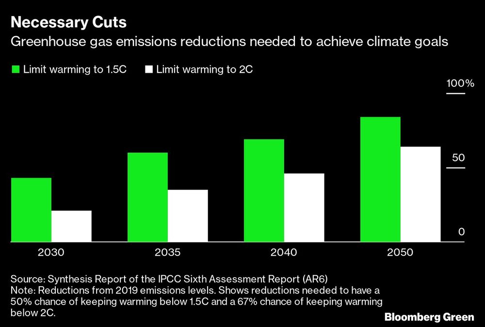 The IPCC report stressed that continuing to burn fossil fuels threatens human well-being and the stability of much of life on Earth, with the chance of avoiding the most severe impacts moving rapidly out of reach. One of the most controversial conclusions was that greenhouse gas emissions have to be cut by 60%, and carbon dioxide pollution has to fall 65%, by 2035 from 2019 levels for a 50% chance of keeping global temperature rise within 1.5 degrees Celsius by the end of the century. That’s the target that global leaders agreed on in the landmark Paris Agreement and what scientists say is needed to avoid the worst effects of climate change.