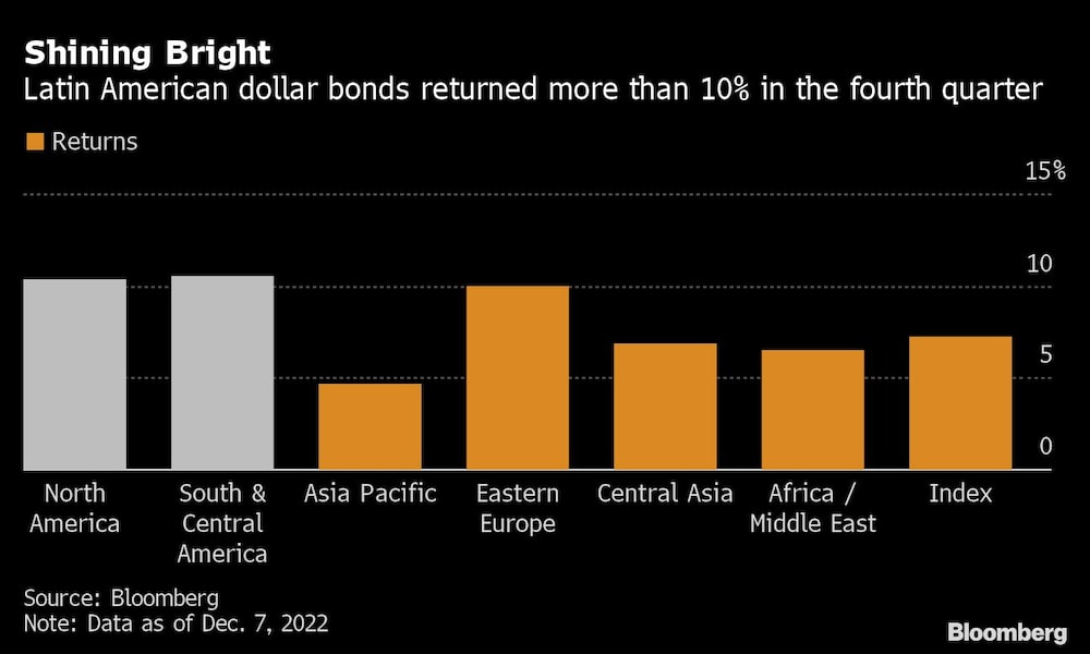 Dollar-denominated debt from Latin American governments and companies has handed investors returns of more than 10% so far this quarter, outperforming all other regions in an emerging-market index that has returned 7% in that period. China’s move away from Covid Zero, the potential end of the Fed’s interest-rate hiking cycle and quieter politics could all help the region’s notes shine even brighter in the new year.