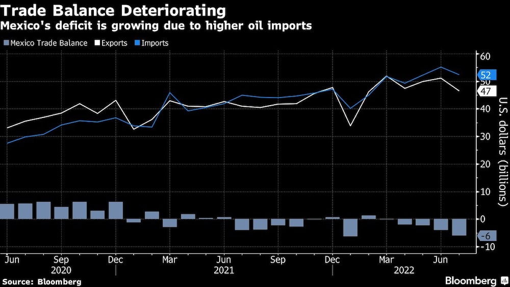 Bloomberg — Mexico’s trade deficit widened more than expected last month as the cost of imported fuel soared while consumer goods imports also jumped.