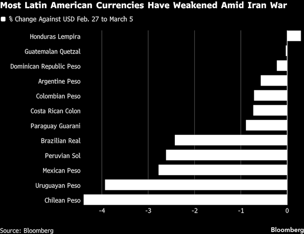 Las naciones importadoras de energía como Chile y los países más pequeños como la República Dominicana, ya agobiados por los esfuerzos de Washington para atenuar la influencia china y reafirmar su dominio sobre las Américas, son ahora vulnerables a las repentinas subidas del precio del petróleo gracias a la guerra en Irán. Las divisas que habían disfrutado de un soleado comienzo en 2026 se han depreciado bruscamente a medida que los operadores, recelosos de la crisis, buscan refugio en el dólar.