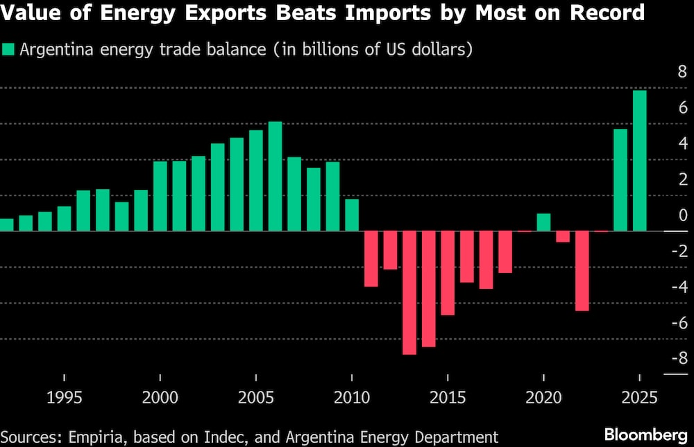 Bloomberg — Argentina registró su mayor superávit anual en el comercio energético en al menos 33 años, en medio del auge de la producción de petróleo y gas en la formación de shale Vaca Muerta.