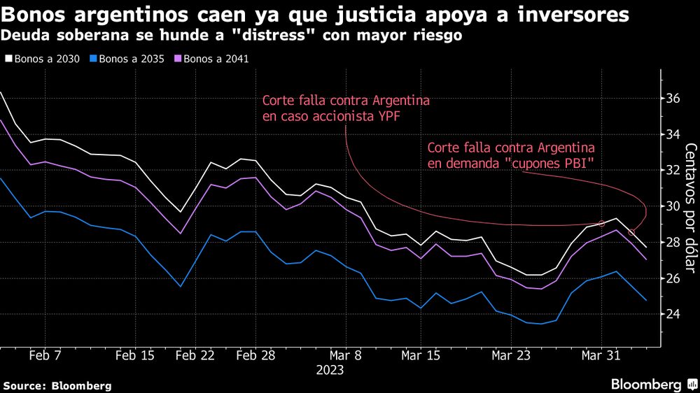 Los bonos en dólares de Argentina se hundieron después de una corte estadounidense y otra británica fallaran a favor de inversores del país en una serie de demandas que demandan, por un lado, pagos vinculados a títulos atados al crecimiento del PBI y, por otro, a la nacionalización de la petrolera YPF hace una década.