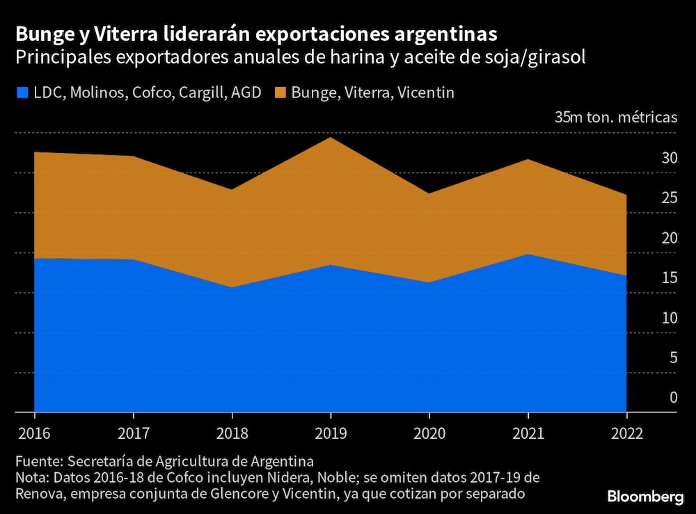 La nueva compañía podría llegar a controlar el 40% de la capacidad de procesamiento de semillas oleaginosas del país, en caso de que se concrete una operación previamente acordada para rescatar al proveedor de soja en quiebra Vicentin SAIC, según cálculos de Bloomberg basados en datos de la corredura de cereales JJ Hinrichsen. Es probable que esto desencadene el escrutinio de las autoridades reguladoras.