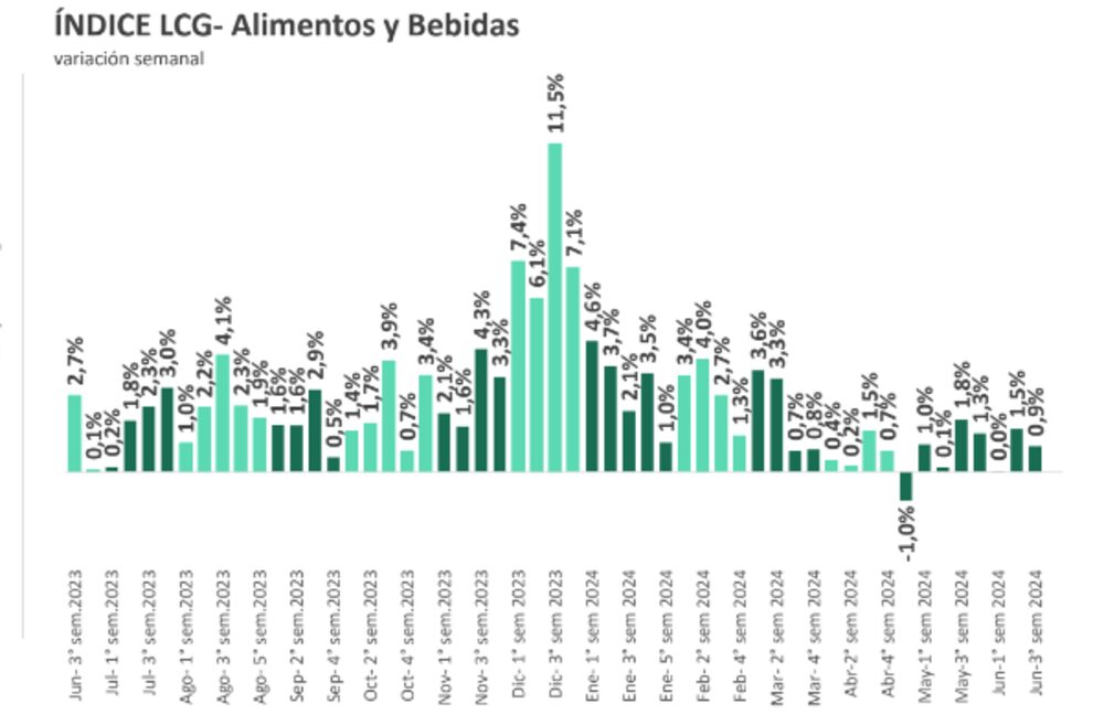 La consultora LCG consideró que la tercera semana de junio cerró con una inflación de 0,9% en alimentos y bebidas, al tiempo que la suba promedia el 3,8% punta a punta.