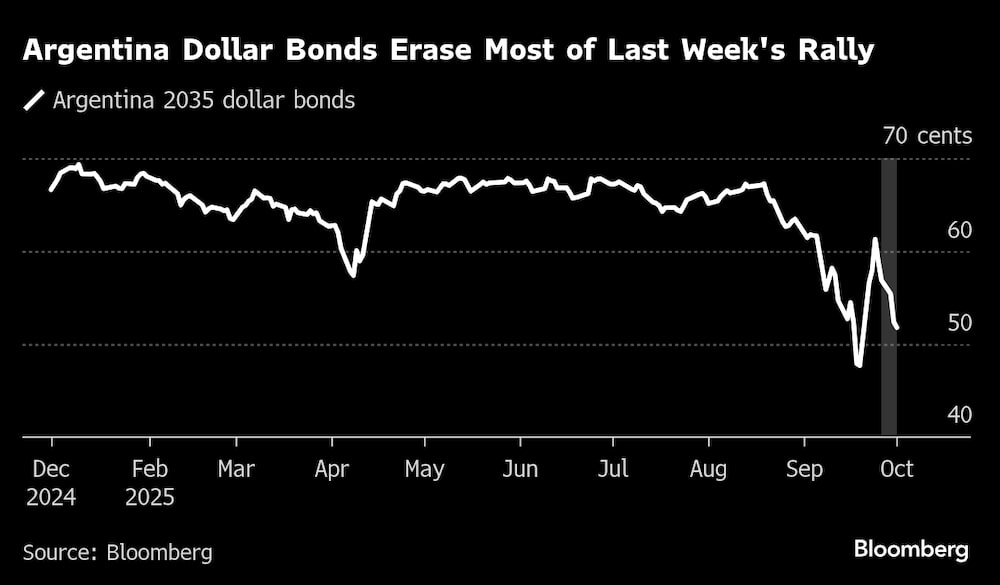Algunos de los pagarés denominados en dólares más líquidos del soberano, con vencimiento en 2035, han perdido más de 5 centavos en las últimas tres sesiones, borrando gran parte de las ganancias registradas tras la promesa de apoyo de Bessent el 22 de septiembre. El peso retrocedió aún más en las operaciones del miércoles, y ahora ha bajado alrededor de un 7% en lo que va de semana.