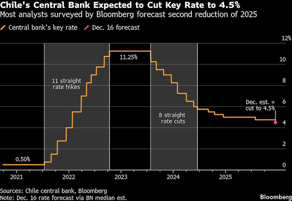 Bloomberg — El banco central de Chile redujo su tasa de interés clave en un cuarto de punto por segunda vez este año, aunque adelantó su pronóstico de cuándo la inflación alcanzará la meta.