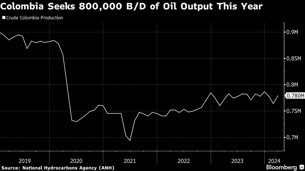 Bloomberg — Colombia tiene como objetivo una producción de petróleo de un millón de barriles diarios presionando a los perforadores para que intensifiquen la actividad en bloques de exploración infrautilizados, según el máximo responsable energético del país.