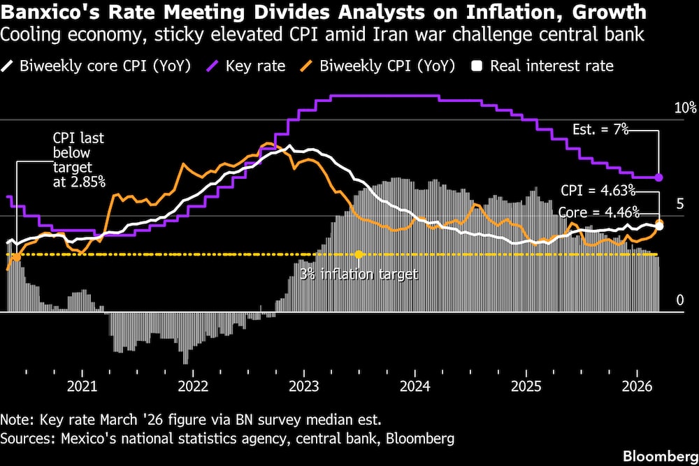 La falta de consenso refleja nuevas presiones internas y externas. Banxico, como se conoce al banco, podría mantener las tasas para contener los riesgos inflacionistas alimentados en parte por el aumento de los costos energéticos tras semanas de guerra en Irán. Alternativamente, podría citar el débil crecimiento económico y su propia estimación de que la inflación se suavizará hasta el objetivo del 3% el próximo año para justificar un pequeño recorte.