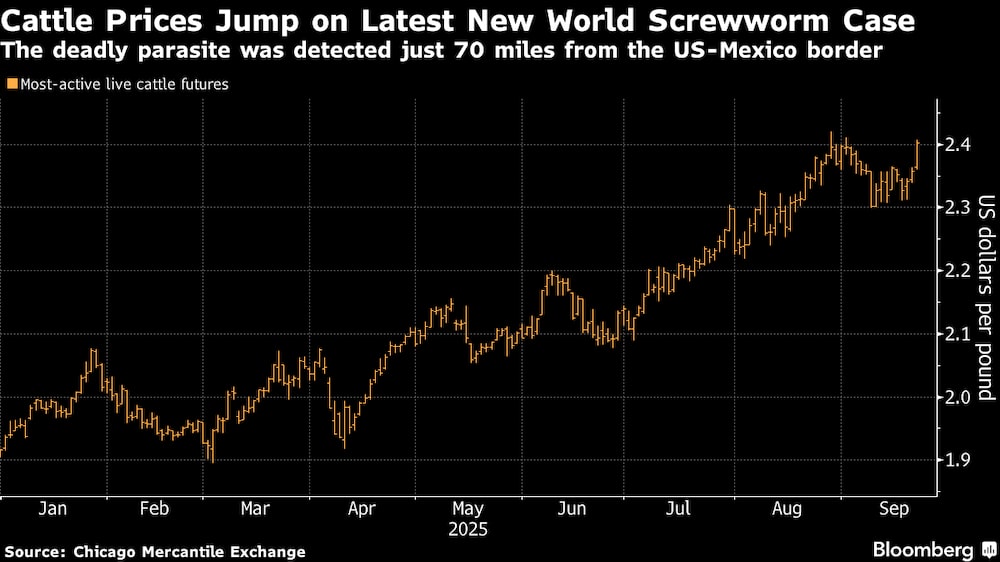 Bloomberg — Los precios de los futuros del ganado subieron al nivel más alto en casi tres semanas después de que se detectara una plaga mortal en México a sólo 70 millas (112 kilómetros) de la frontera con Estados Unidos.