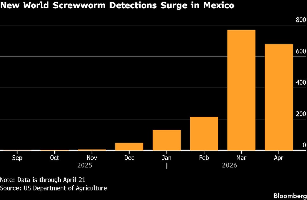 Se han notificado casi 700 casos del gusano barrenador del ganado del Nuevo Mundo en México este mes, con casi el 40% de esas detecciones en la semana que terminó el 2 de abril, según el Departamento de Agricultura estadounidense.