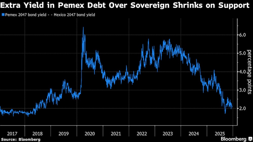 Ese repunte se produjo cuando México se dio un atracón de deuda sin precedentes al vender más de US$41.000 millones en bonos soberanos en divisas fuertes en 2025, declarando explícitamente que los fondos de algunas de sus operaciones se destinarían a una aportación de capital al productor de petróleo, conocido como Pemex. La medida reforzó las expectativas de que la presidenta Claudia Sheinbaum seguirá apoyando a la empresa, lo que ha hecho que los rendimientos de los bonos de Pemex se acerquen más a los de la deuda del gobierno mexicano, un indicio de que los inversores ven un riesgo significativamente menor que hace unos meses.