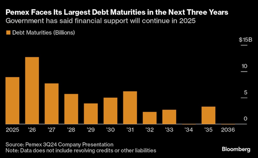 Los inversionistas apuestan a que el apoyo gubernamental para cubrir esos vencimientos continuará. Los bonos de Pemex subieron a finales del mes pasado después de que la empresa dijera que estaba trabajando en un plan de gestión de pasivos que se publicaría después de que el gobierno diera a conocer su presupuesto para 2025.