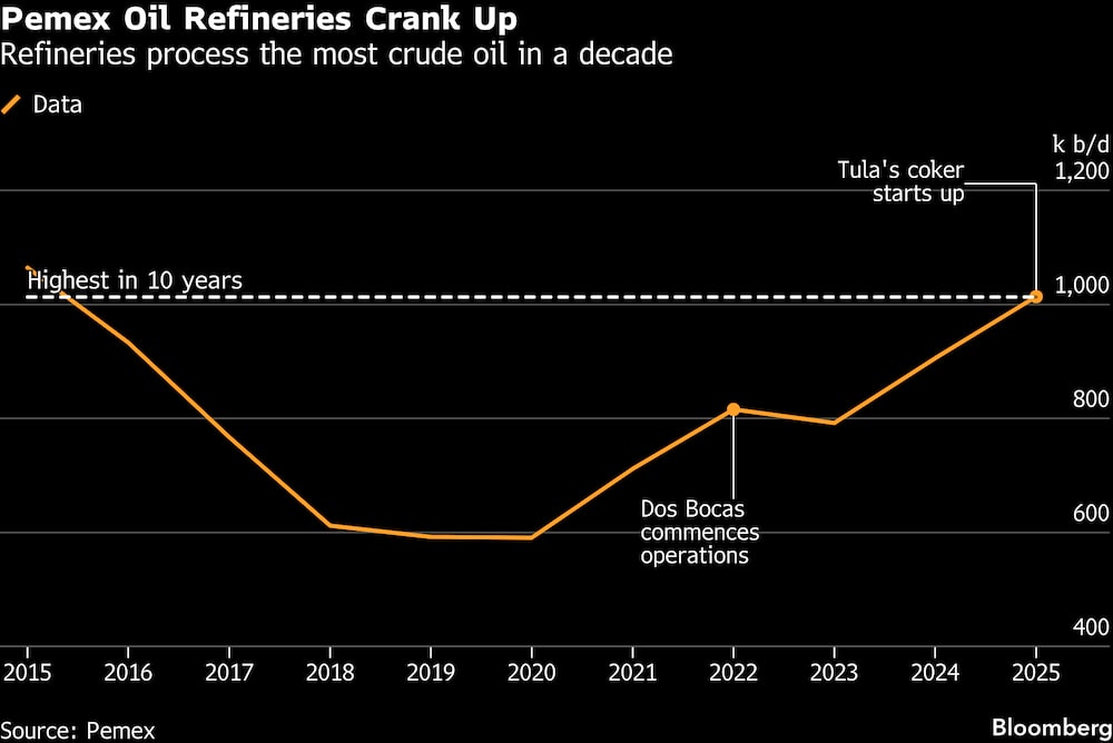 El aumento de la producción de combustible está siendo impulsado en gran medida por la puesta en marcha de la planta de Dos Bocas. La refinería, también conocida como Olmeca, operó al 77,5% de su capacidad instalada en diciembre, su mejor rendimiento hasta la fecha, según datos de la empresa recopilados por Bloomberg.