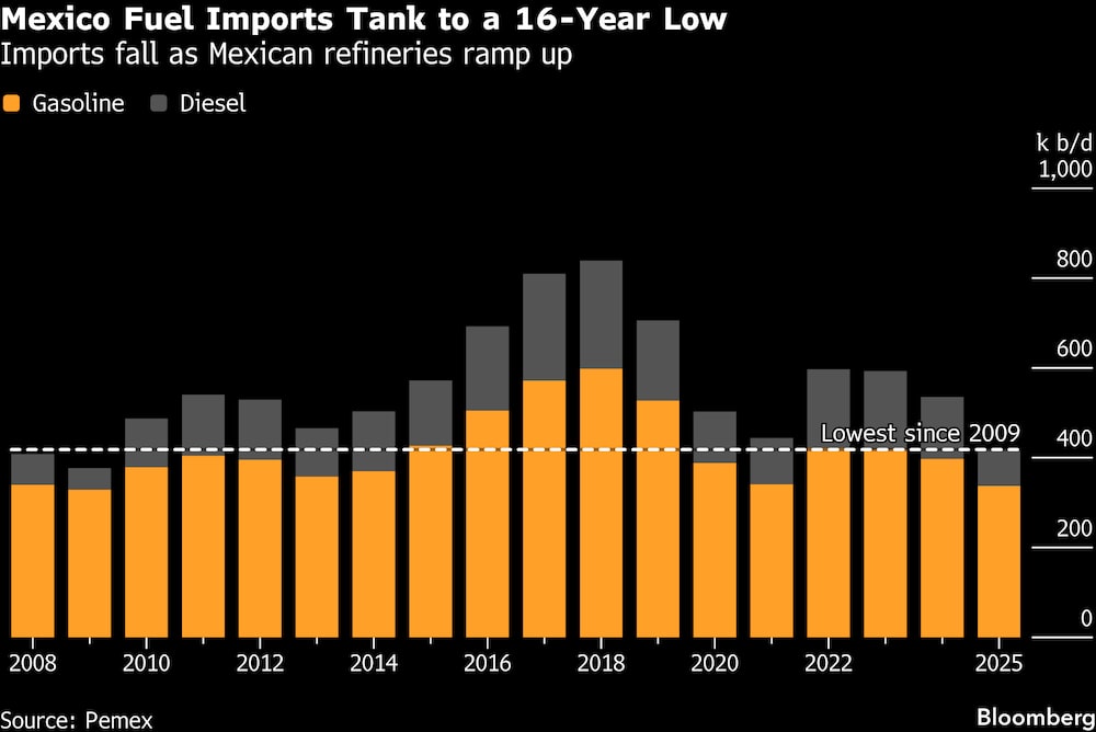 Las importaciones de gasolina y gasóleo de Petróleos Mexicanos cayeron a su nivel más bajo en 16 años el año pasado, según datos de la empresa. Las importaciones disminuyeron mientras la petrolera estatal operaba sus refinerías a las tasas más altas en una década. Mientras tanto, la mayor refinería del país, Dos Bocas, se está poniendo en marcha por fin tras varios arranques en falso desde su inauguración hace casi cuatro años.