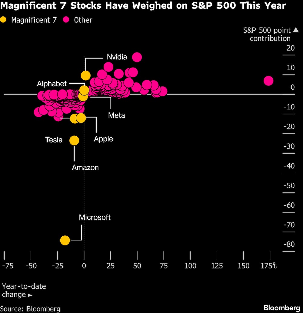 Nvidia no está sola en este aprieto. Los Siete Magníficos gigantes tecnológicos, que han sido los que más han contribuido a las ganancias del mercado bursátil en los últimos años, llevan meses haciendo aguas. Un índice Bloomberg del grupo ha perdido casi un 1% desde el inicio del cuarto trimestre, con un rendimiento inferior al del S&P 500 en ese periodo.