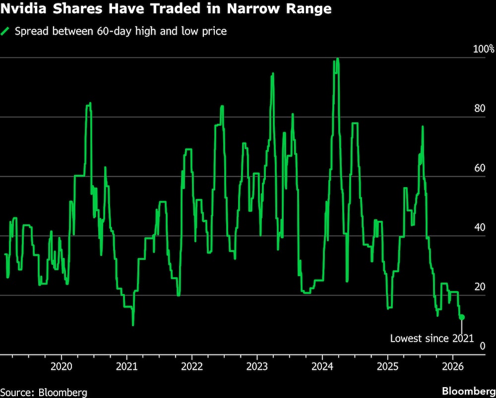 El precio de las acciones de Nvidia ha ido a la deriva durante meses, subiendo solo un 1,7% desde el inicio del cuarto trimestre, algo menos que la ganancia del 3,3% del índice S&P 500 en ese tiempo. Las acciones son apenas positivas para el año y se encuentran en la mitad inferior de los rendidores en el amplio índice de referencia de renta variable para comenzar 2026. Es toda una caída para una empresa que no hace mucho estaba entre las líderes del índice y registraba ganancias porcentuales anuales de tres dígitos.