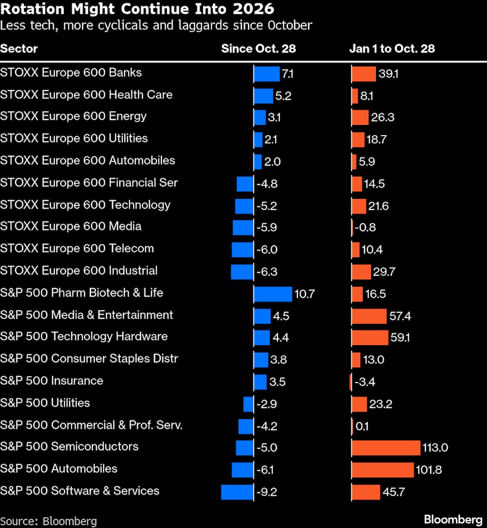 Los inversores han estado rotando sus asignaciones durante los dos últimos meses a medida que el comercio de IA y semiconductores se estanca y surgen opciones más atractivas en otros lugares. Es un patrón que se observa tanto en EE.UU. como en Europa, aunque los detalles difieren entre las regiones. La rotación ayuda a ampliar la fortaleza dentro del mercado, ya que ve cómo los inversores persiguen una mezcla de valores expuestos a la economía, posicionamientos defensivos y apuestas en sectores rezagados.