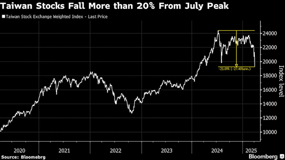 El índice de referencia Taiex cayó hasta un 9,8% el lunes, llevando su descenso desde el máximo alcanzado en julio a más del 20%. La caída se produce después de que los aranceles impuestos por EE.UU. amenacen con desestabilizar las cadenas de suministro y ralentizar el crecimiento. Taiwan Semiconductor Manufacturing Co. (TSM), que tiene una ponderación superior a un tercio en el índice, se deslizó por el límite diario de la bolsa del 10%. El dólar taiwanés se desplomó un 0,4% el lunes.