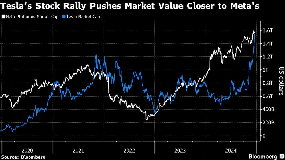 Sin embargo, Tesla Inc. (TSLA) de Elon Musk se está poniendo al día, con una ganancia del 93% en lo que va de año que ha impulsado su capitalización bursátil hasta los US$1,5 billones. El fabricante de vehículos eléctricos se ha beneficiado de los estrechos vínculos de Musk con el presidente electo Donald Trump, así como de unos resultados mejores de lo esperado.
