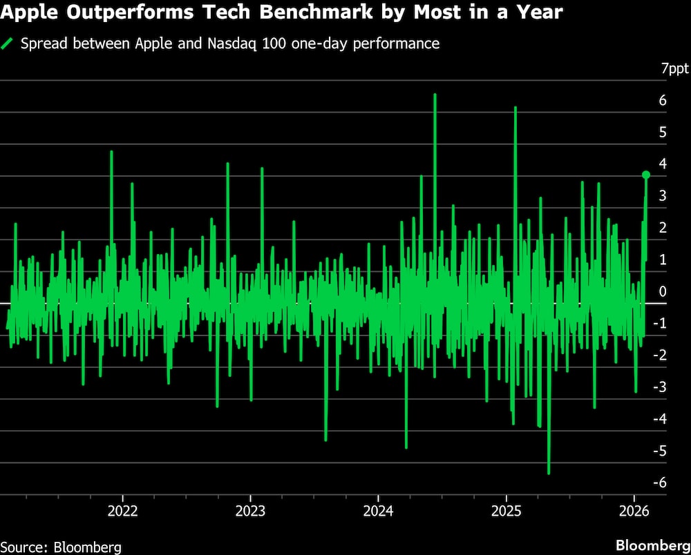 La divergencia refleja tanto las tendencias positivas en Apple como la creciente incertidumbre en gran parte del sector tecnológico. Los resultados de Apple de la semana pasada presentaron unas ventas trimestrales récord y unas previsiones mejores de lo esperado. Al mismo tiempo, las nuevas herramientas de IA de Alphabet Inc. y la startup Anthropic han provocado la venta generalizada de valores tecnológicos, ya que los inversores temen que los servicios de IA se coman el crecimiento.
