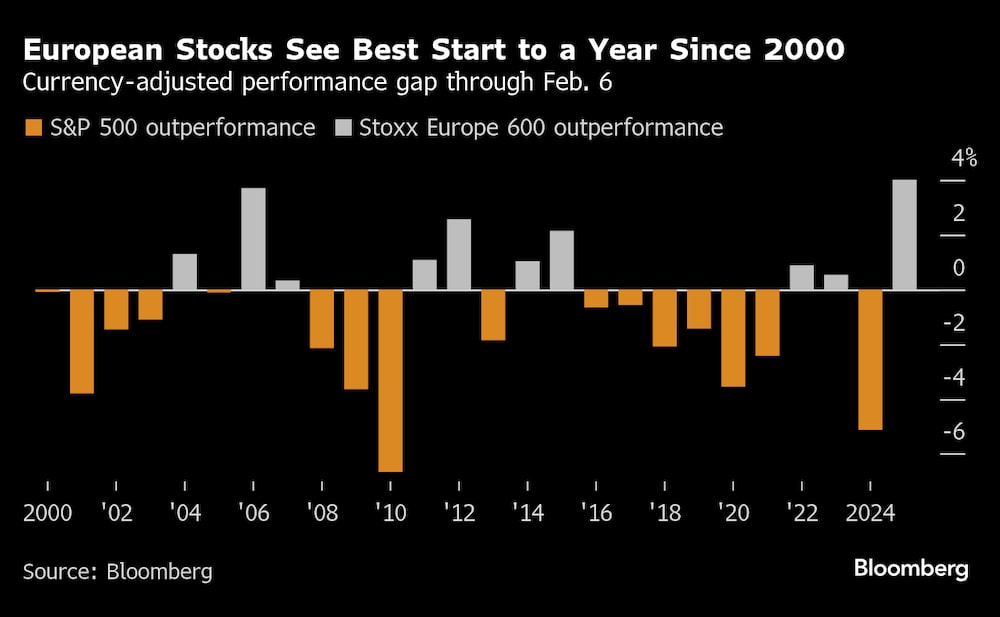 El índice Stoxx 600 europeo está teniendo su mejor comienzo de año registrado en dólares frente al índice S&P 500, en parte porque algunos de los gigantes estadounidenses de las grandes tecnológicas han flaqueado.