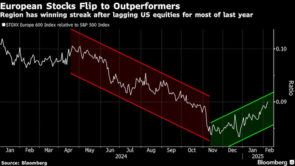 Mientras tanto, un índice de los llamados Siete Magníficos valores está plano para comenzar 2025, con un escepticismo creciente en torno al dominio de EE.UU. en el desarrollo de la tecnología de inteligencia artificial. Una encuesta realizada el mes pasado por Bank of America Corp. (BAC) mostró que la asignación de los inversores a la renta variable europea pasó a una sobreponderación neta del 1% desde una infraponderación del 22%, el segundo mayor salto en la exposición al continente en 25 años.