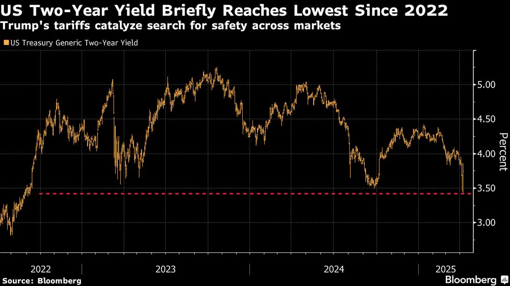 En torno al 3,73%, los rendimientos de los bonos del Tesoro a dos años siguen siendo casi 20 puntos básicos inferiores a sus niveles de la semana pasada. En un momento dado, el lunes, la tasa tocó su marca más baja desde 2022, ya que los inversores impulsaron las apuestas a que la Reserva Federal intervendrá para recortar las tasas de interés.