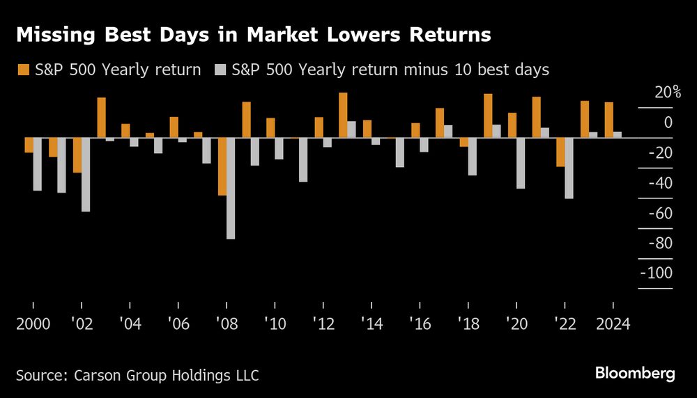 Los repuntes bruscos son especialmente importantes para acertar. El S&P 500 ha subido un 9,5% anual de media en los últimos 35 años. Sin embargo, si se pierde los 10 mejores días, su rentabilidad se reduce a una pérdida del 12,5%, según los datos recopilados por Ryan Detrick, estratega jefe de mercado de Carson Group Holdings LLC.