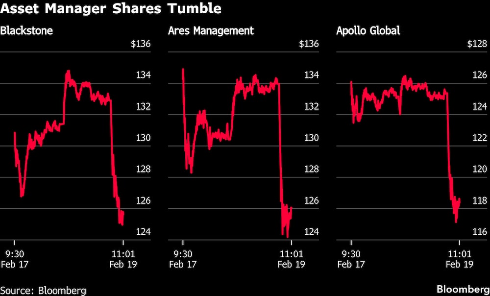 Las acciones de Blue Owl cayeron hasta un 9,4%, mientras que sus homólogas Ares Management Corp. (ARES), Apollo Global Management Inc. (APO), Blackstone Inc. (BX), KKR & Co Inc. (KKR) y TPG Inc. (TPG) también se desplomaron.