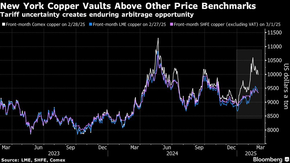 Mientras las empresas mineras se reúnen en Toronto para una de las mayores conferencias del sector, el cobre se perfila como un tema candente después de que Trump hiciera del metal rojo su próximo objetivo arancelario. Los posibles gravámenes han creado una oportunidad de beneficios a medida que se amplía la brecha entre los precios en EE.UU. y el resto del mundo.