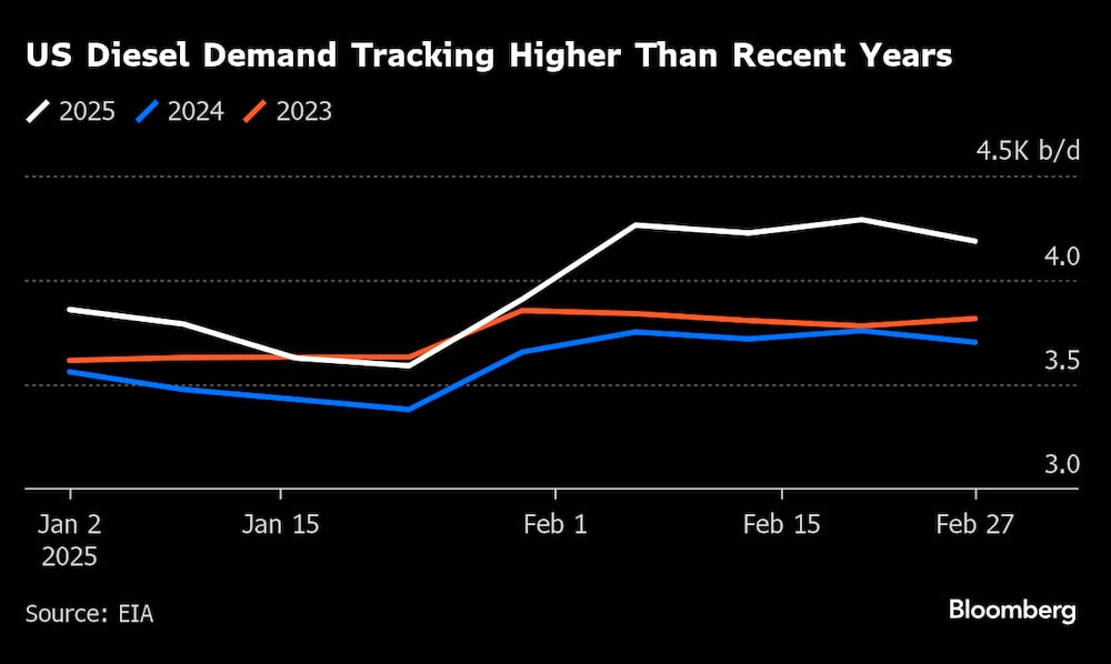 La demanda estadounidense de gasóleo es mayor y los inventarios son menores que en 2024 y 2023, pero los precios en el surtidor y en el mercado de futuros son más baratos.