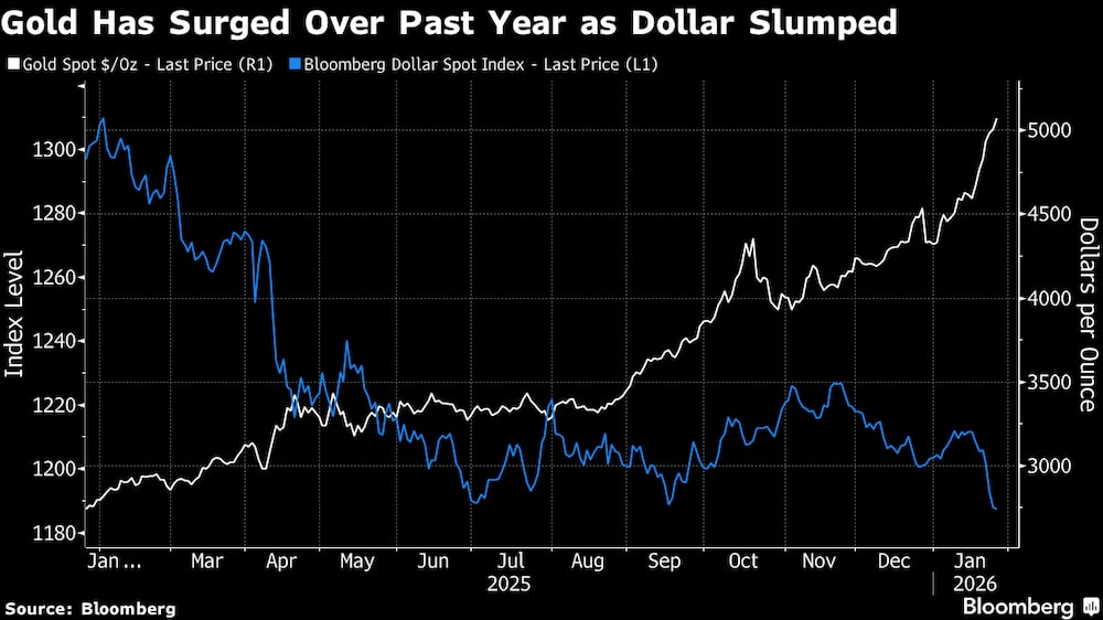 El oro se encaminó el martes hacia un séptimo día de ganancias, tras superar el lunes por primera vez los 5.000 dólares la onza. El lingote ha subido un 85% en los últimos 12 meses, mientras que el índice del dólar de Bloomberg ha caído un 8,5%.