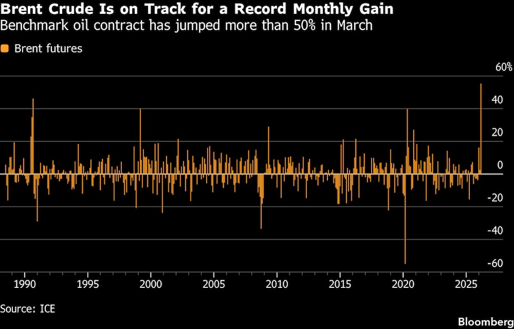 El Brent se ha disparado más de un 50% en marzo, ya que la guerra entre EEUU, Israel e Irán ha trastornado los mercados mundiales. El conflicto ha entrado en su quinta semana y no muestra signos de remitir a pesar del impulso diplomático de Washington la semana pasada y de las conversaciones de paz mantenidas por separado durante el fin de semana en Pakistán.