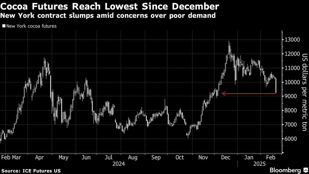 Los futuros cayeron hasta un 10% para alcanzar el nivel más bajo desde principios de diciembre. La reciente subida del cacao a máximos históricos por la escasa producción en África Occidental tiene al mercado atento a cualquier señal de que la demanda pueda estar ralentizándose.