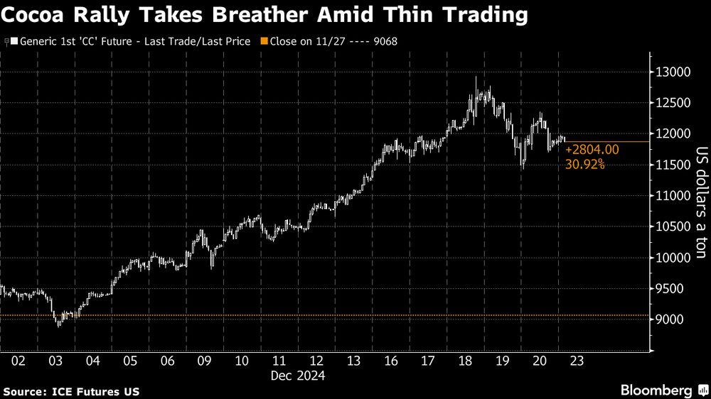 El contrato más activo retrocedió en medio de una negociación escasa en vísperas de los días festivos. Los futuros alcanzaron la semana pasada un récord, impulsados por las previsiones de reducción de la producción en los principales productores, Costa de Marfil y Ghana, en un momento en que la oferta ya es escasa.