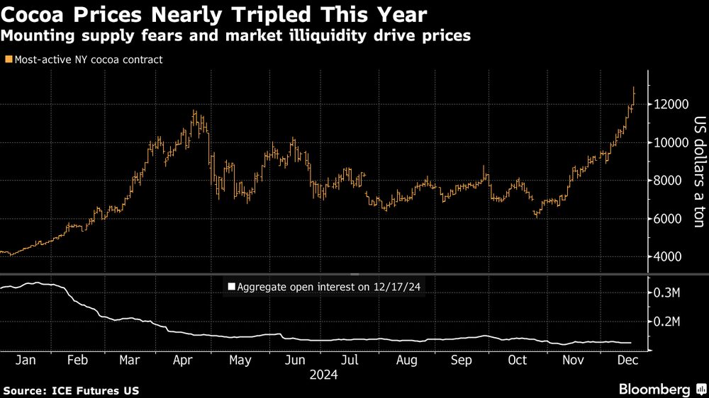 Los precios casi se han triplicado debido a que la vacilante producción en África Occidental -la región de mayor crecimiento del mundo- provocó una escasez masiva de suministros. Muchos comerciantes, quemados por el aumento de los costos para mantener posiciones, huyeron del mercado a medida que el repunte ganaba fuerza, y los fabricantes de chocolate se abstuvieron de cubrir los nuevos inventarios en un intento de conseguir precios más bajos.