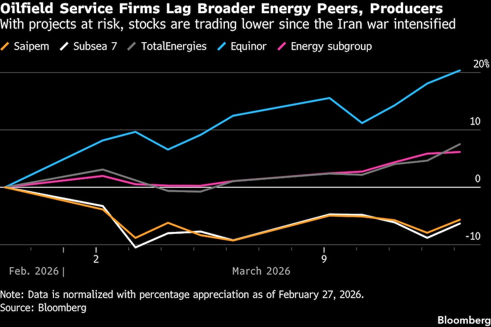 Los valores de servicios petrolíferos se han quedado rezagados, ya que los riesgos para las operaciones en Oriente Próximo eclipsan los beneficios a largo plazo de la subida de los precios.