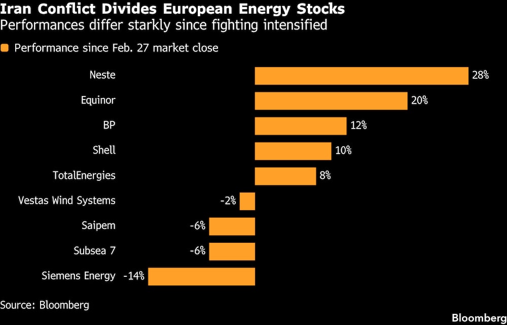 Mucho depende de cómo se desarrolle el conflicto de Irán, pero hasta ahora los inversores han acudido en masa a las empresas que están en posición de capitalizar los mayores márgenes de refinado y precios de los productos en Europa. El índice del sector energético Stoxx 600 ha subido un 6% desde que estalló la guerra.