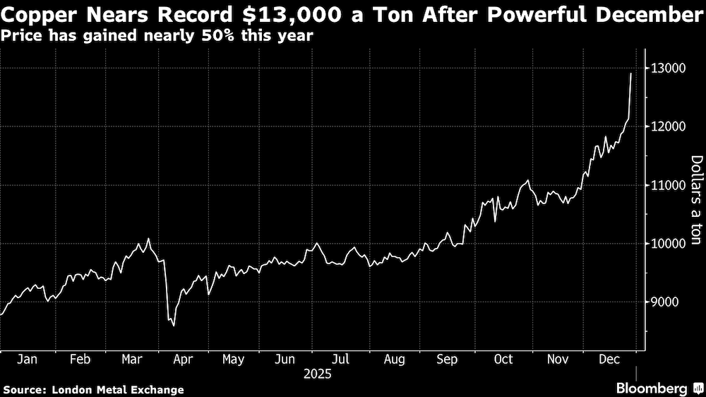 El metal, crucial para las energías renovables y las redes eléctricas, subió hasta un 6,6% hasta los US$12.960 la tonelada en la Bolsa de Metales de Londres al reanudarse las operaciones tras un festivo de dos días en el Reino Unido. Las ganancias han llegado a superar el 15% en diciembre, ya que los inversores apuestan a que la prisa por hacer llegar el metal a EE.UU. ante los posibles aranceles a la importación obligará a los compradores de otros países a pagar más.