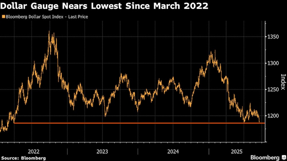 Bloomberg — El indicador de Bloomberg sobre el dólar se acercó a su nivel más bajo desde marzo de 2022 antes de la decisión de la Reserva Federal, donde se espera que los responsables políticos reanuden la reducción de las tasas de interés para apuntalar un mercado laboral debilitado.