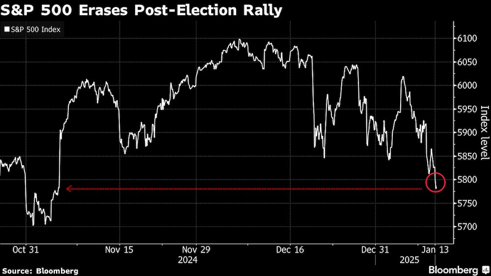 En un momento del lunes, el índice S&P 500 cayó por debajo de donde terminó el 5 de noviembre, justo antes de que Donald Trump fuera elegido presidente. Los inversores se han deshecho de las acciones y las tasas de interés están subiendo a medida que crece el temor a que la inflación siga siendo obstinada y la Reserva Federal tenga que recortar sus planes de aplicar una mayor relajación monetaria para combatirla.