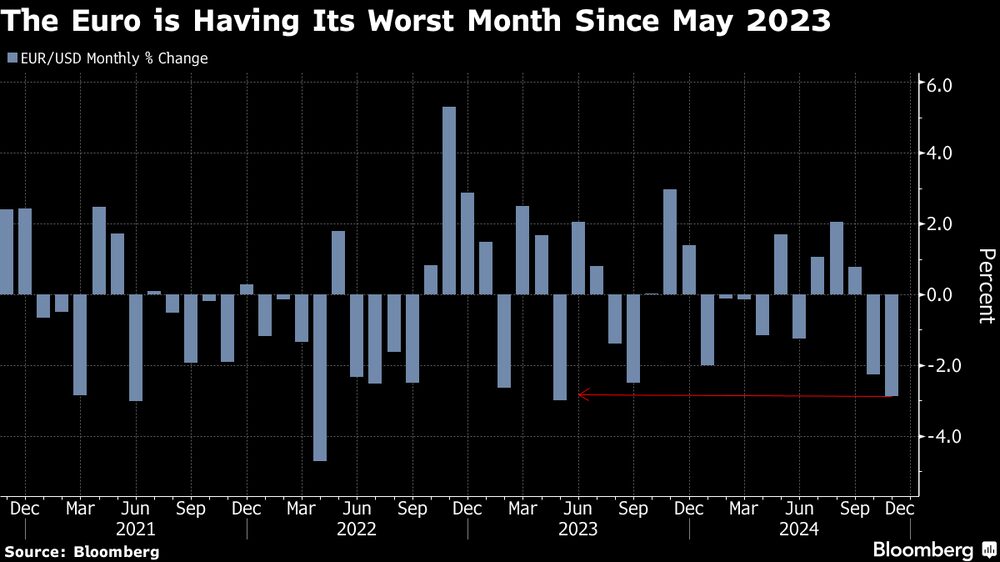 El euro ha caído en desgracia ante la preocupación de los inversores de que la economía europea se resienta si Donald Trump impone aranceles a las importaciones estadounidenses, lo que podría llevar a los responsables políticos a recortar los tipos de interés de forma más agresiva. Las señales de estancamiento del crecimiento y la agitación política en Alemania y Francia, las dos mayores economías del bloque, también han contribuido a las ventas.