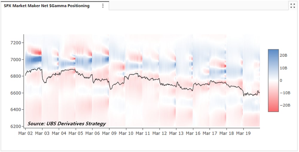 La baja volatilidad realizada para el S&P 500 no concuerda con el posicionamiento de los operadores de opciones. Ha surgido un consenso entre la mayoría de los estrategas de derivados de que los operadores estaban cortos de gamma de cara al vencimiento trimestral. La volatilidad realizada es notablemente más alta intradía que de cierre a cierre, que es donde potencialmente la gamma de los operadores está teniendo un mayor impacto en el mercado.