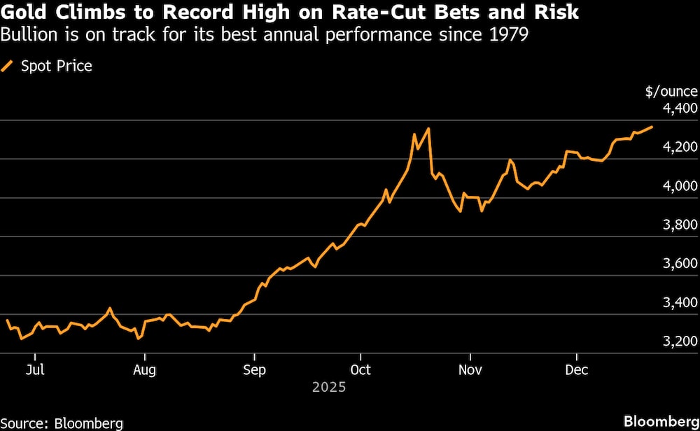 Bloomberg — El oro subió a un máximo histórico, con el aumento de las tensiones geopolíticas y las apuestas a más recortes de tasas de la Reserva Federal añadiendo ímpetu al mejor rendimiento anual en más de cuatro décadas.