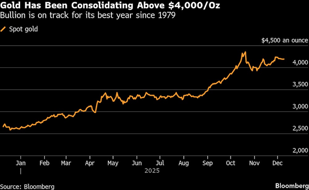 El oro ha ganado aproximadamente un 60% este año, impulsado por las elevadas compras de los bancos centrales y las fuertes entradas en los fondos cotizados. Aunque ha retrocedido desde un máximo de más de US$4.380 la onza a finales de octubre, ha encontrado apoyo en las expectativas de una mayor relajación monetaria en EE.UU. Pacific Investment Management Co. espera que el oro siga registrando buenos resultados, ya que los bancos centrales poseen más oro que bonos del Tesoro.