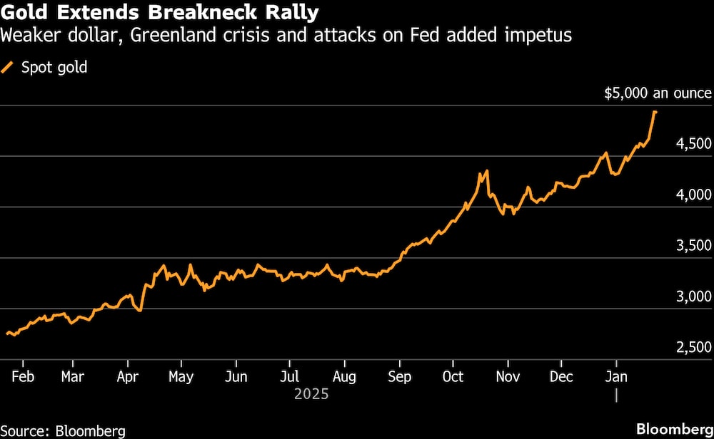 Recién salido de su mejor rendimiento anual desde 1979, el lingote ha prolongado un rally vertiginoso para ganar otro 15% a principios de este año. Los renovados ataques del presidente estadounidense Donald Trump contra la Reserva Federal, así como la intervención militar en Venezuela y las amenazas de anexionarse Groenlandia, han añadido ímpetu al llamado comercio de devaluación, por el que los inversores se alejan de los bonos soberanos y las divisas en favor de refugios alternativos como el oro.
