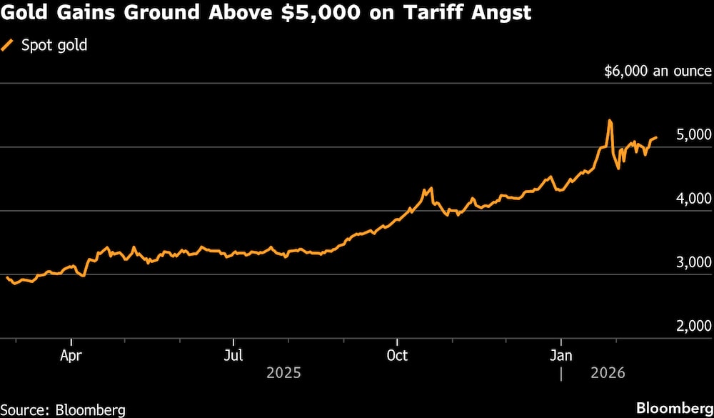 El lingote subió hasta un 1,4% hacia los US$5.180 la onza. El presidente Donald Trump dijo el sábado que impondría un arancel global del 15% para preservar las medidas después de que el Tribunal Supremo fallara en contra de su uso de los poderes de emergencia para establecer aranceles. Un dólar más débil abarató el metal para muchos compradores.