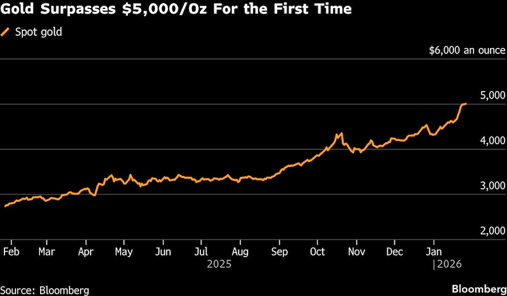 Bloomberg — El oro subió por encima de los 5.000 dólares la onza por primera vez, extendiendo un repunte vertiginoso alimentado por la remodelación de las relaciones internacionales del presidente estadounidense Donald Trump y la huida de los inversores de los bonos soberanos y las divisas.