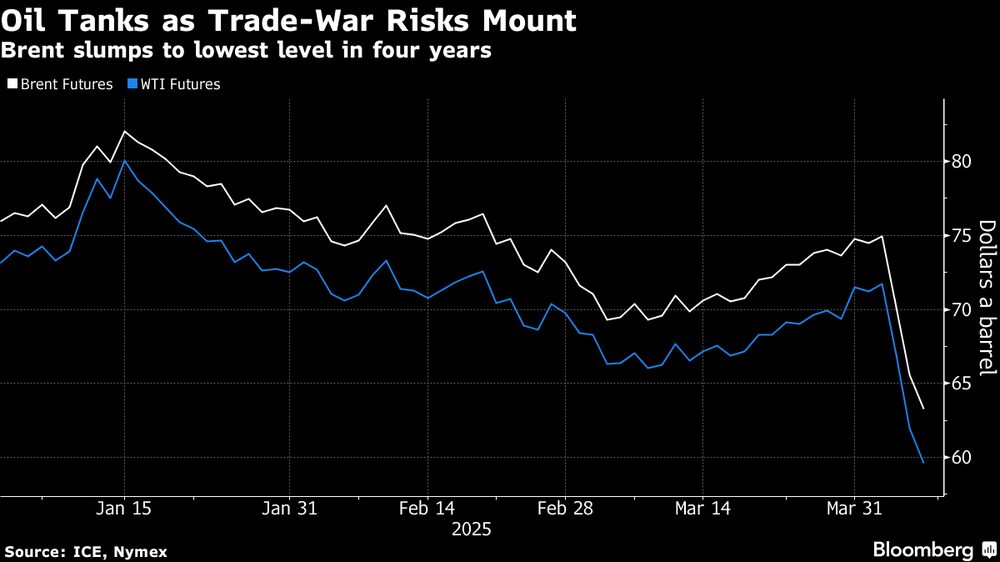 El barril de Brent, de referencia mundial, cayó casi un 4%, hasta US$63,01, el nivel más bajo en cuatro años, tras desplomarse un 11% la semana pasada, mientras que el West Texas Intermediate (WTI) se situó en US$59,93. El productor estatal Saudi Aramco rebajará el crudo Arab Light a sus mayores compradores en Asia en US$2,30 el barril para mayo. La medida se produjo pocos días después de que la alianza OPEP+ anunciara un aumento inesperado de la producción.